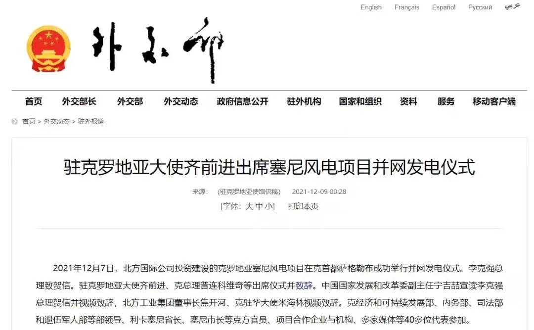 2021年12月7日,中國兵器工業(yè)集團有限公司北方公司所屬北方國際投資、建設(shè)和運營的塞尼156MW風(fēng)電項目在克羅地亞首都薩格勒布隆重舉行并網(wǎng)發(fā)電儀式。李克強總理致賀信。克羅地亞總理安德烈·普連科維奇,中國駐克羅地亞大使齊前進出席儀式并致辭。中國國家發(fā)展和改革委員會副主任寧吉喆宣讀李克強總理賀信并視頻致辭,中國兵器工業(yè)集團有限公司董事長焦開河、克駐華大使米海林視頻致辭。 中華人民共和國外交部報道 普連科維奇總理在致辭中表示,感謝李克強總理發(fā)來賀信,他與中國領(lǐng)導(dǎo)人一直非常重視塞尼風(fēng)電項目投資與建設(shè)。祝賀項目克服疫情與地震等影響,成功并網(wǎng)發(fā)電。增加清潔可再生能源、綠色電力對克乃至歐洲都很重要,克政府的重要戰(zhàn)略和目標之一就是低碳發(fā)展和增加清潔能源供應(yīng)。塞尼風(fēng)電項目占克總發(fā)電量將達3.5%,對克實現(xiàn)2022年可再生能源比例30%目標具有很大幫助。此次投資使北方國際成為在克最大的清潔能源投資企業(yè)。非常歡迎更多中國企業(yè)擴大對克投資。 寧吉喆宣讀李克強總理賀信并視頻致辭時表示,2017年11月第六次中國—中東歐國家領(lǐng)導(dǎo)人會晤期間,在李克強總理和普連科維奇總理等中東歐16國領(lǐng)導(dǎo)人的共同見證下,塞尼項目簽署了協(xié)議。項目既是中國堅定踐行綠色發(fā)展理念的具體體現(xiàn),也是中國深化與克羅地亞、與中東歐國家務(wù)實合作的生動實踐。希望中克兩國政府部門,企業(yè)等有關(guān)各方共同努力、相互配合,運營好塞尼項目,打造出中歐綠色合作的樣板,帶動兩國務(wù)實合作持續(xù)深入發(fā)展,造福兩國人民。 焦開河在致辭時表示,在塞尼項目投入運營之際,李克強總理專門致信祝賀。作為塞尼項目的投資方、建設(shè)方、運營方,我們備受鼓舞,深感自豪!未來,中國兵器工業(yè)集團有限公司將繼續(xù)深入貫徹落實習(xí)近平總書記重要指示批示精神和李克強總理賀信重要要求,以高標準、可持續(xù)、惠民生為目標,與克方合作伙伴坦誠溝通、攜手并進,進一步推動綠色能源建設(shè),努力打造更多的“一帶一路”標志性、引領(lǐng)性、示范性項目,為鞏固中克戰(zhàn)略合作伙伴關(guān)系、推進中克從經(jīng)貿(mào)領(lǐng)域到全方位合作貢獻積極力量。 齊前進祝賀塞尼風(fēng)電項目順利完工和成功并網(wǎng)發(fā)電。他表示,塞尼風(fēng)電站項目并網(wǎng)發(fā)電是中克兩國領(lǐng)導(dǎo)人親自關(guān)注和推動的成果。作為迄今最大的中國在克投資合作項目,塞尼風(fēng)電項目是中克和中歐綠色合作的典范,對克提高清潔能源生產(chǎn)消費發(fā)揮著重要作用。項目建設(shè)過程中為當?shù)嘏囵B(yǎng)了許多工程、技術(shù)和管理人才,帶動了當?shù)仄髽I(yè)發(fā)展,增加了就業(yè)和稅收,促進了當?shù)亟?jīng)濟社會發(fā)展,充分體現(xiàn)了中國對外經(jīng)貿(mào)合作與“一帶一路”倡議秉持的互利共贏、共同發(fā)展的理念,也是中國積極倡導(dǎo)的綠色低碳發(fā)展合作的典范。 塞尼項目位于克羅地亞中部亞得利亞海沿岸,建設(shè)總投資1.79億歐元,總裝機容量156MW,采用39臺4MW風(fēng)力發(fā)電機組設(shè)備,風(fēng)場面積達42.8平方公里。項目正式運營后,預(yù)計每年平均發(fā)電超3000小時,貢獻約5.3億度綠色電力,可減少二氧化碳排放約46萬噸,將為克羅地亞促進能源轉(zhuǎn)型、發(fā)展綠色經(jīng)濟提供強勁助力,貢獻了“中國智慧”“中國方案”。 來源/中華人民共和國外交部、綜合有關(guān)報道 |