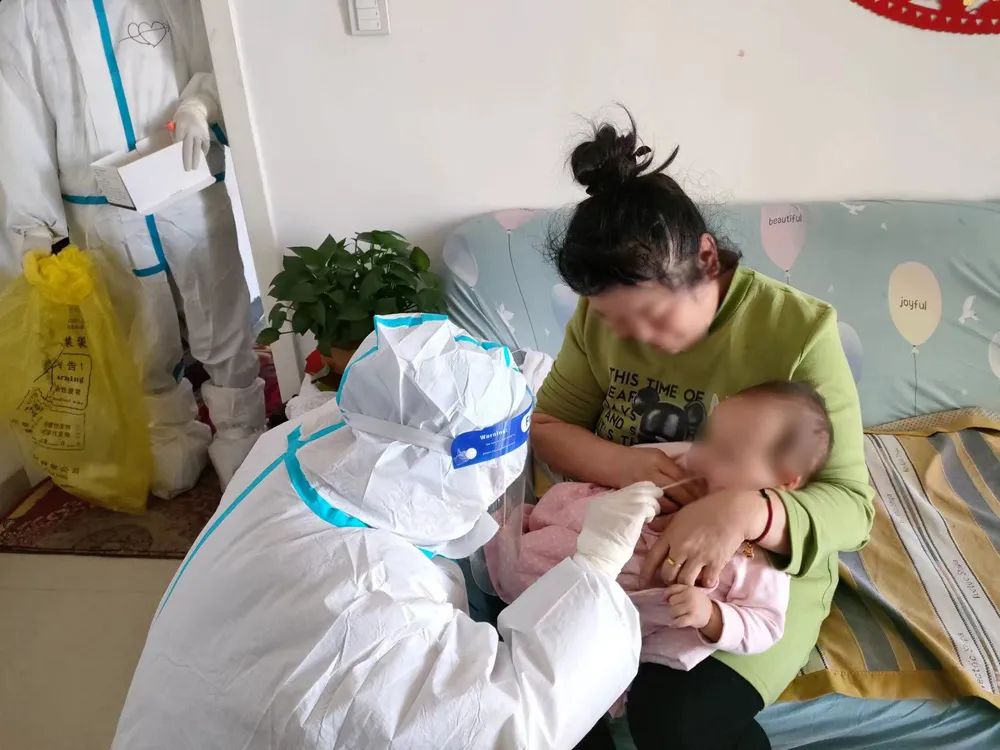 為確保所支援地區完成全員核酸檢測工作,志愿者自愿組隊,挨家挨戶上門通知,進行人員核對,對于處在隔離期的居民以及行動不便的老人、兒童采取了入戶核酸檢測。