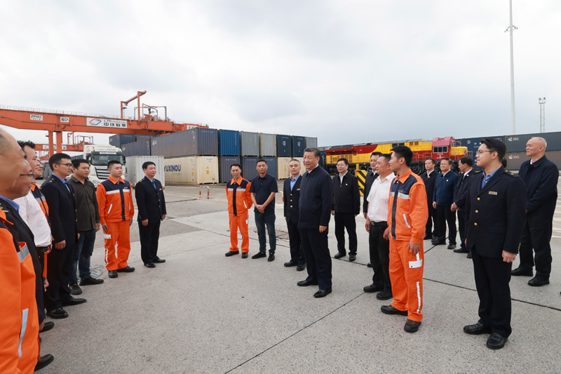 4月22日至24日,中共中央總書記、國家主席、中央軍委主席習近平在重慶考察。這是22日下午,習近平在重慶國際物流樞紐園區重慶鐵路集裝箱中心站,同貨車司機、列車司機、裝卸工人、場站管理人員等親切交流。